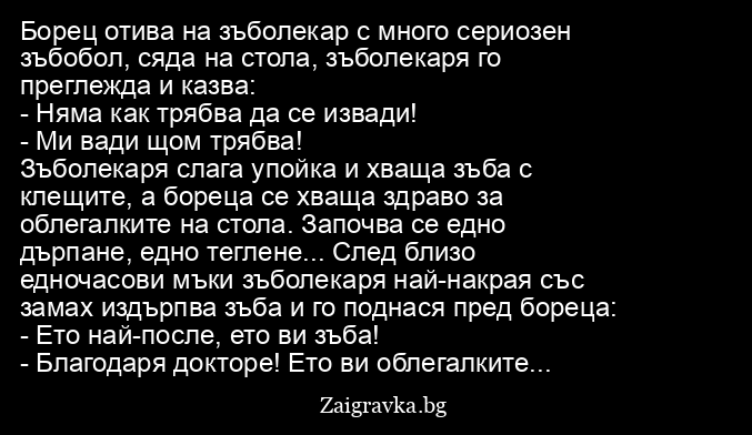 Борец отива на зъболекар с много сериозен зъбобол, сяда на стола, зъболекаря го преглежда и казва: