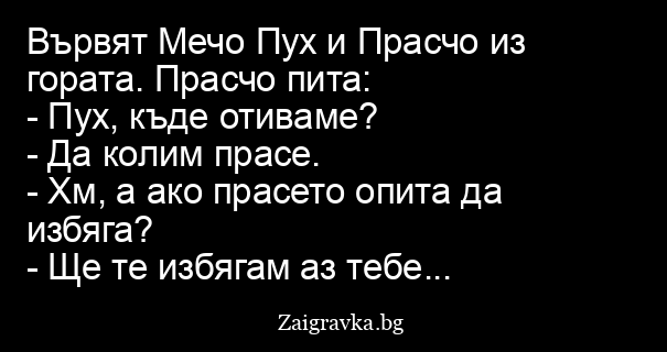 Вървят Мечо Пух и Прасчо из гората. Прасчо пита: