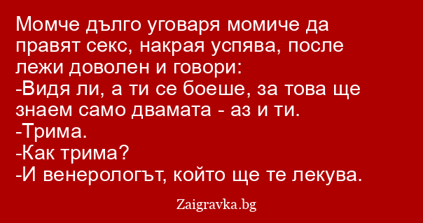 Момче дълго уговаря момиче да правят секс, накрая успява, после лежи доволен и говори: