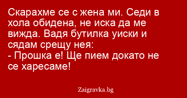 Скарахме се с жена ми. Седи в хола обидена, не иска да ме вижда. Вадя бутилка уиски и сядам срещу нея: