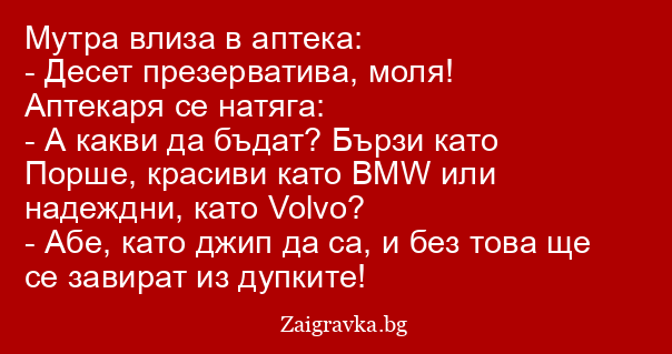 Един кюстендилец продава ябълки на пазара, като е сложил табела "Против забременяване". Много жени купуват, а по едно време една притичва зачервена от къщи и пита:
