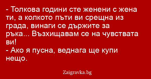 - Толкова години сте женени с жена ти, а колкото пъти ви срещна из града, винаги се държите за ръка... Възхищавам се на чувствата ви!