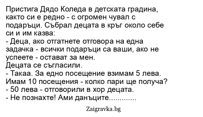 - Деца, ако отгатнете отговора на една задачка - всички подаръци са ваши, ако не успеете - остават за мен.