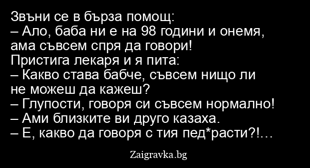 – Ало, баба ни е на 98 години и онемя, ама съвсем спря да говори!