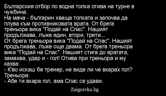 На мача - българин хваща топката и започва да плува към противниковата врата. От брега треньора вика "Подай на Спас". Нашият продължава, лъже един, втори, трети...