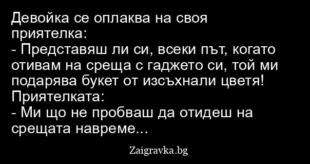 - Представяш ли си, всеки път, когато отивам на среща с гаджето си, той ми подарява букет от изсъхнали цветя!