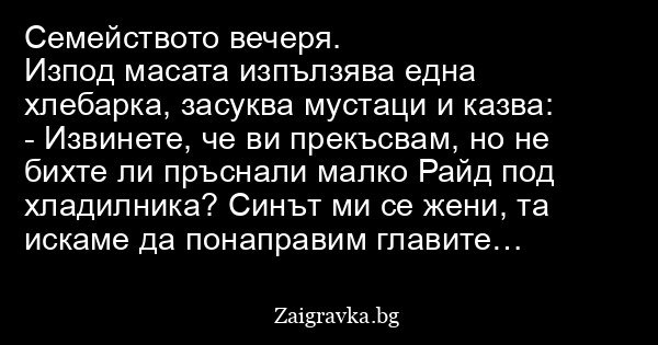 - Извинете, че ви прекъсвам, но не бихте ли пръснали малко Райд под хладилника? Синът ми се жени, та искаме да понаправим главите…