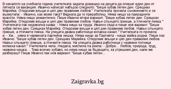В началото на учебната година учителката задала домашно на децата да опишат един ден от лятната си ваканция. Иванчо написал набързо следното: