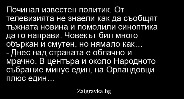 Починал известен политик. От телевизията не знаели как да съобщят тъжната новина и помолили синоптика да го направи. Човекът бил много объркан и смутен, но нямало как…