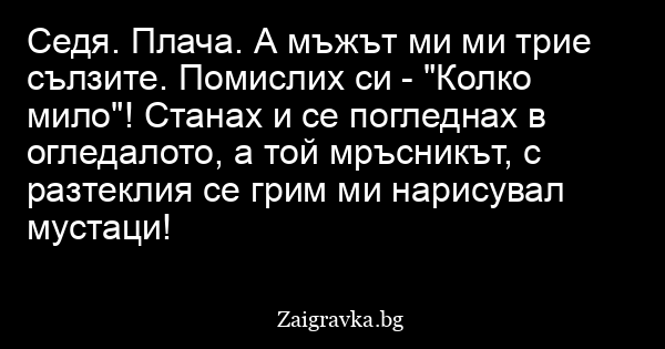 Седя. Плача. А мъжът ми ми трие сълзите. Помислих си - "Колко мило"! Станах и се погледнах в огледалото, а той мръсникът, с разтеклия се грим ми нарисувал мустаци!