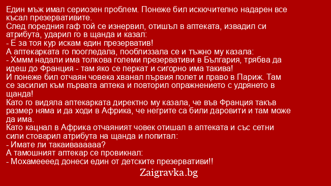Като го видяла аптекарката директно му казала, че във Франция такъв размер няма и да ходи в Африка, че негрите са били даровити и там може да има.