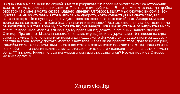В едно списание за жени по случай 8 март в рубриката:"Въпроси на читателките" са отговорили този път мъже от екипа на списанието. Препечатваме рубриката: