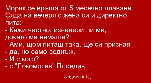 Моряк се връща от 5 месечно плаване. Сяда на вечеря с жена си и директно пита: