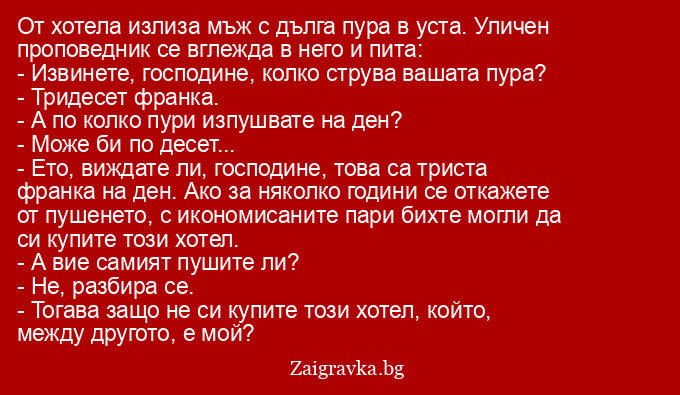 От хотела излиза мъж с дълга пура в уста. Уличен проповедник се вглежда в него и пита: