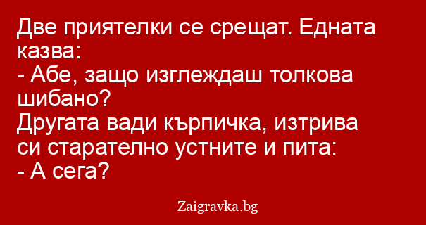 Другата вади кърпичка, изтрива си старателно устните и пита: