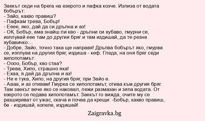 - Добре, Зайо, точно така ще направя! Дръпва бобърът яко, гмурва се, изплува на другия бряг, издиша - кеф. Гледа, на оня бряг седи хипопотамът:
