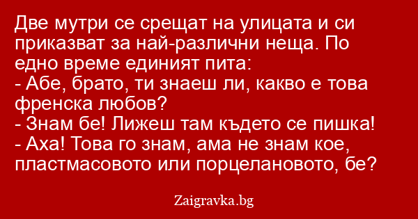 Две мутри се срещат на улицата и си приказват за най-различни неща. По едно време единият пита: