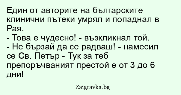 - Не бързай да се радваш! - намесил се Св. Петър - Тук за теб препоръчваният престой е от 3 до 6 дни!