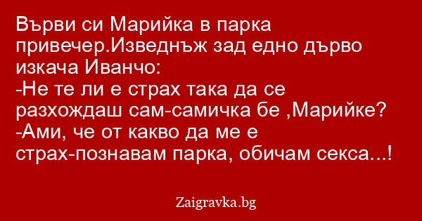 Върви си Марийка в парка привечер.Изведнъж зад едно дърво изкача Иванчо: