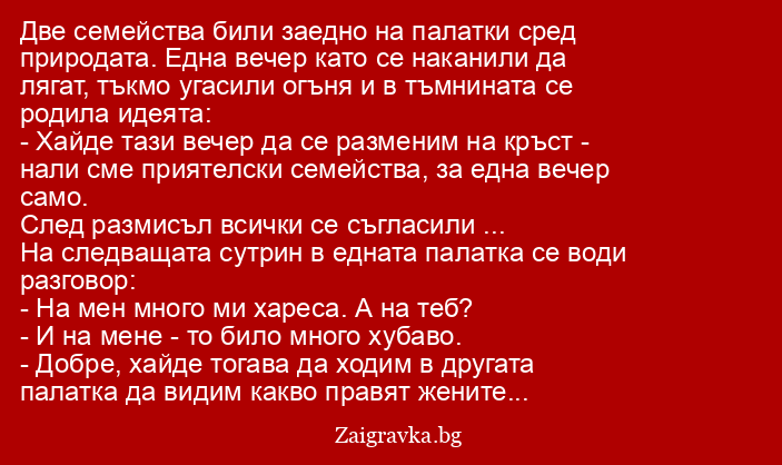 - Хайде тази вечер да се разменим на кръст - нали сме приятелски семейства, за една вечер само.