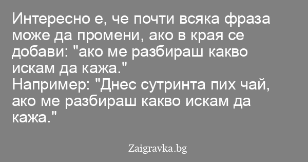 Интересно е, че почти всяка фраза може да промени, ако в края се добави: "ако ме разбираш какво искам да кажа."