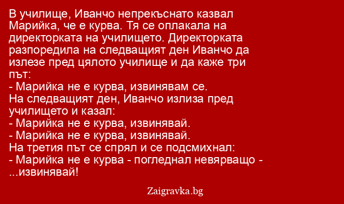 В училище, Иванчо непрекъснато казвал Марийка, че е курва. Тя се оплакала на директорката на училището. Директорката разпоредила на следващият ден Иванчо да излезе пред цялото училище и да каже три път: