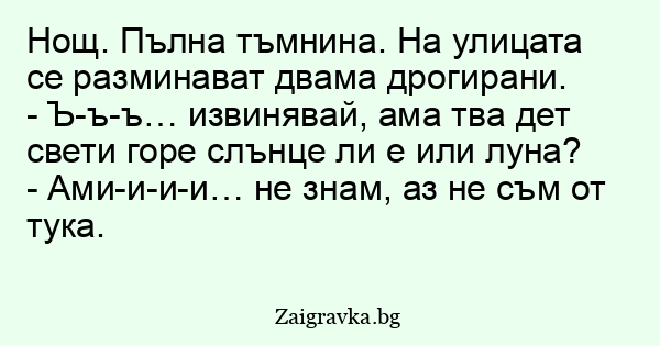 Нощ. Пълна тъмнина. На улицата се разминават двама дрогирани.