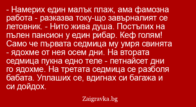- Намерих един малък плаж, ама фамозна работа - разказва току-що завърналият се летовник. - Нито жива душа. Постъпих на пълен пансион у един рибар. Кеф голям! Само че първата седмица му умря свинята - ядохме от нея осем дни. На втората седмица пукна едно теле - петнайсет дни го ядохме. На третата седмица се разболя бабата. Уплаших се, вдигнах си багажа и си дойдох.