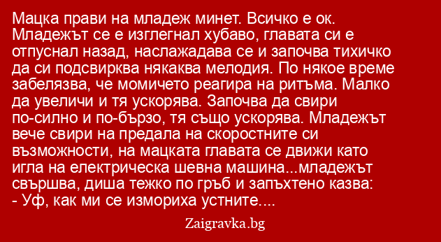 Мацка прави на младеж минет. Всичко е ок. Младежът се е изглегнал хубаво, главата си е отпуснал назад, наслажадава се и започва тихичко да си подсвирква някаква мелодия. По някое време забелязва, че момичето реагира на ритъма. Малко да увеличи и тя ускорява. Започва да свири по-силно и по-бързо, тя също ускорява. Младежът вече свири на предала на скоростните си възможности, на мацката главата се движи като игла на електрическа шевна машина...младежът свършва, диша тежко по гръб и запъхтено казва:
