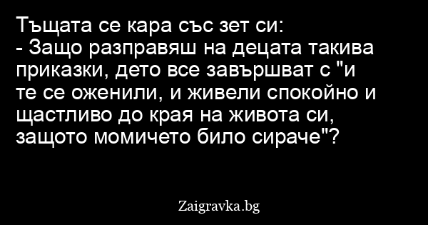 - Защо разправяш на децата такива приказки, дето все завършват с "и те се оженили, и живели спокойно и щастливо до края на живота си, защото момичето било сираче"?