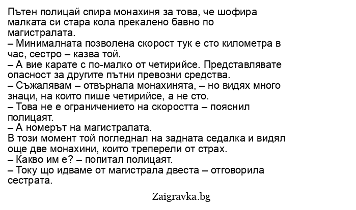 – Минималната позволена скорост тук е сто километра в час, сестро – казва той.
