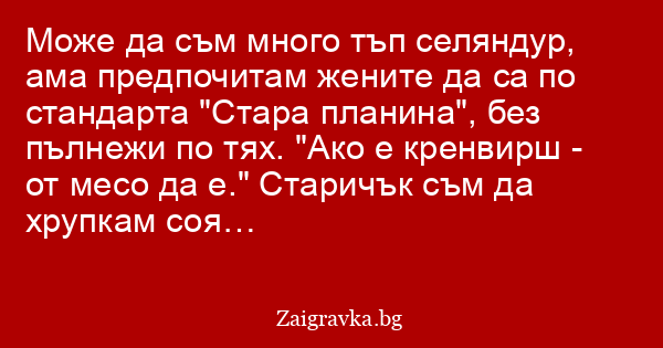 Може да съм много тъп селяндур, ама предпочитам жените да са по стандарта "Стара планина", без пълнежи по тях. "Ако е кренвирш - от месо да е." Старичък съм да хрупкам соя…