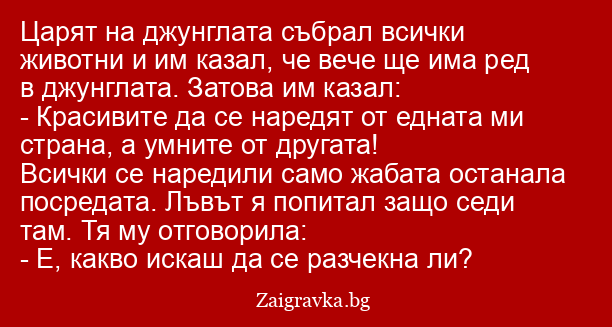 Царят на джунглата събрал всички животни и им казал, че вече ще има ред в джунглата. Затова им казал: