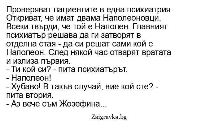 Проверяват пациентите в една психиатрия. Откриват, че имат двама Наполеоновци. Всеки твърди, че той е Наполен. Главният психиатър решава да ги затворят в отделна стая - да си решат сами кой е Наполеон. След някой час отварят вратата и излиза първия.