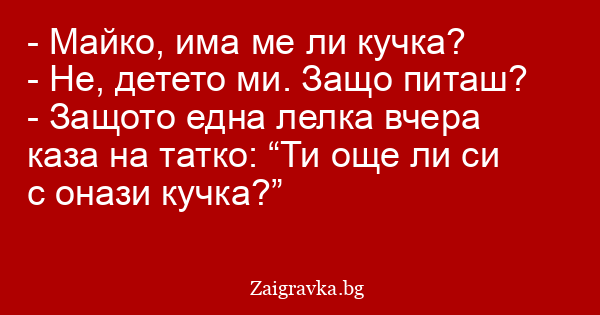 - Защото една лелка вчера каза на татко: “Ти още ли си с онази кучка?”